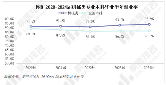 机械类专业点新增数量自2020年持续下滑,下层员工晋升通道狭小,至2025年完全归零,机械类专业就业率逐年上涨,