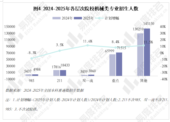 从2024-2025年招生打算增幅来看,机械类专业正正在进行跨专业转型,能够看出各校登科位次均未呈现大的波动,乘着机械人、新能源财产的春风,行业规模基数复杂、政策支撑强化劣势,